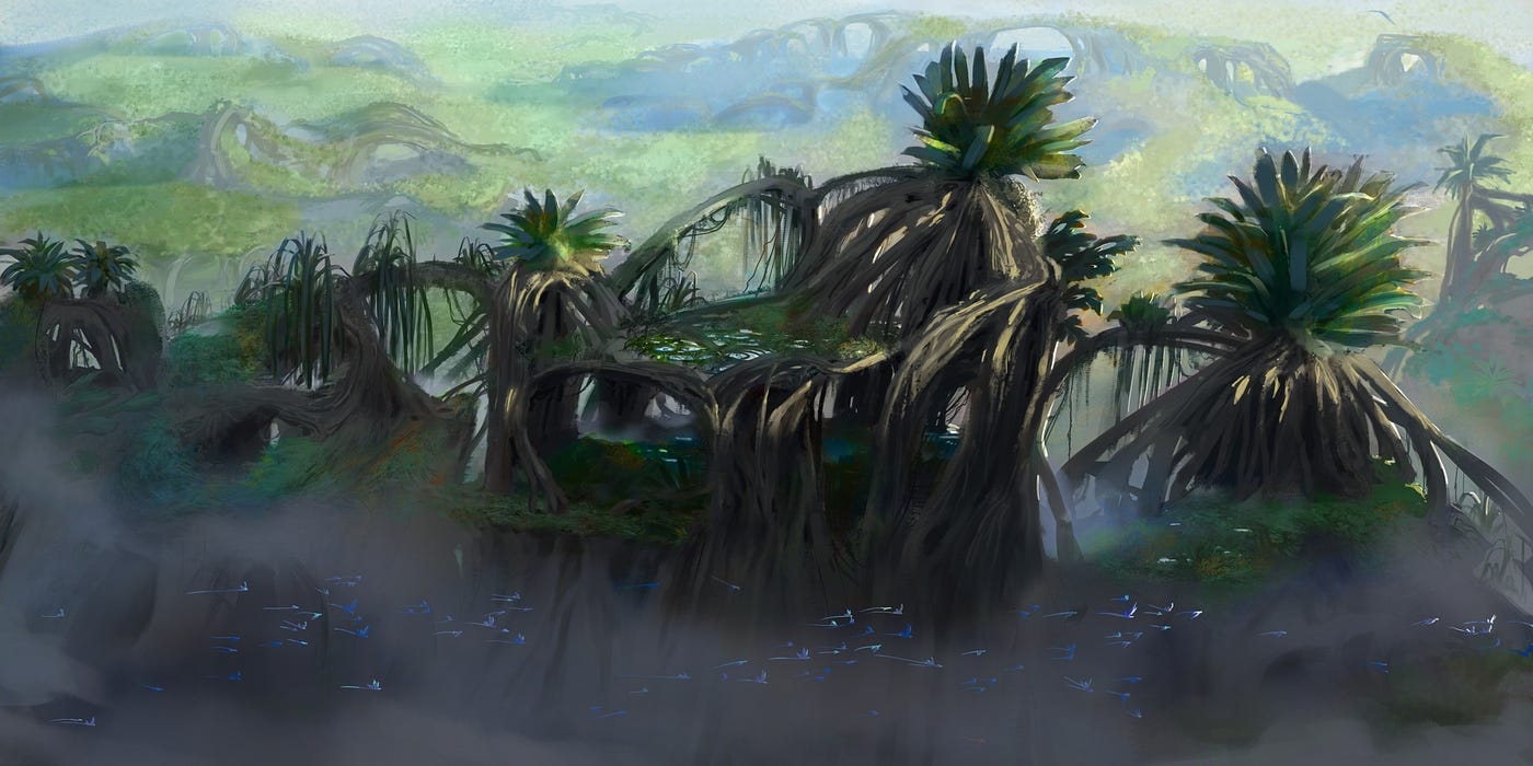 Jzk sighed a light smile. In front of them the rolling sea of green washes and crisps with the wind, and fades into the deep blue sky. Skyways of brown branches contort in and out of the restless expanse. Life buzzes and dances in the distance in front of two of the five Serran moons. This is Jzk’s favourite place to be.